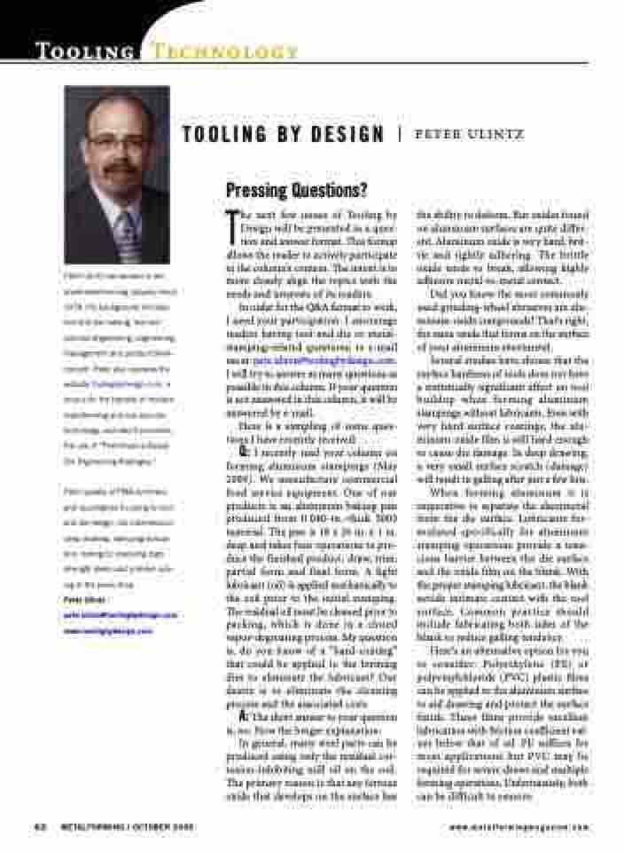 In order for the Q&A format to work, I need your participation. I encourage readers having tool and die or metal- stamping-related questions, to e-mail me at: pete.ulintz@toolingbydesign.com. I will try to answer as many questions as possible in this column. If your question is not answered in this column, it will be answered by e-mail.