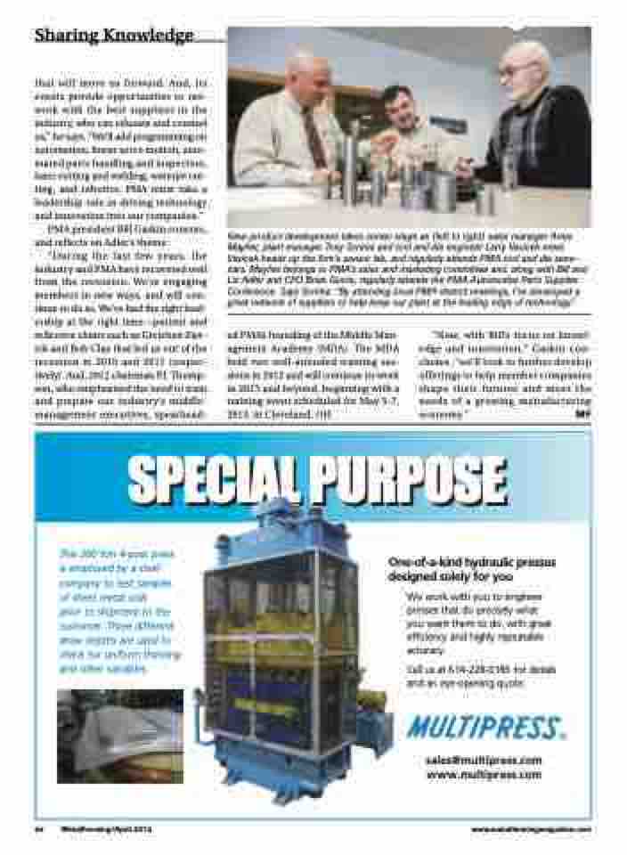 that will move us forward. And, its events provide opportunities to net- work with the best suppliers in the industry, who can educate and counsel us,” he says. “We’ll add programming on automation, linear servo motion, auto- mated parts handling and inspection, laser cutting and welding, waterjet cut- ting, and robotics. PMA must take a leadership role in driving technology and innovation into our companies.”