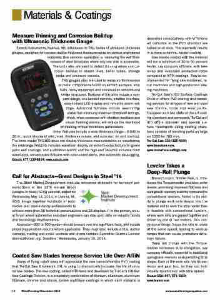 Users of flying cutoff saws will appreciate the new nanocomposite PVD coating that Tru-Cut Saw, Brunswick, OH, is using to dramatically increase the life of circu- lar saw blades. The new coating, called ViTA-Nano and developed by Tru-Cut’s ICO Sur- face Coatings Division, is a proprietary combination of titanium, aluminum, aluminum- titanium, chrome and silicon. Unlike multilayer coatings in which each material is