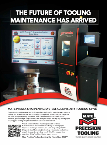 Proper tooling maintenance is critical to produce high quality parts, increase machine uptime and extend tool life. Mate’s PremiaTM Sharpening System ensures the proper result for every sharpening operation. With Premia’s easy-to-use touch screen interface, powerful high-output motor, and ability to accept virtually any tooling style, keeping your tooling in optimal condition has never been easier!