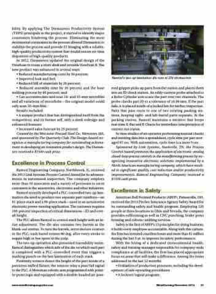 Ramcel Engineering Company, Northbrook, IL, received the 2013 Link Systems Process Control Award for its advance- ments in automated inspection. The company employs more than 50 associates and a variety of processes to serve customers in the automotive, electronics and other industries.