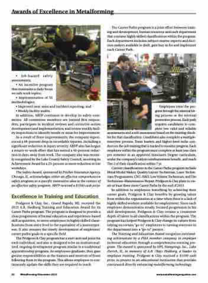 The Training and Education Award recognizes outstand- ing achievement by a PMA member company in employee technical education through a comprehensive training pro- gram. The award is sponsored by HPL Stampings, Inc., Lake Zurich, IL, in memory of A.R. (Ray) Hedberg, a leader in employee training. Pridgeon & Clay received a $1500 cash prize, to present to an educational institution that provides coursework directly enhancing metalforming technology.
