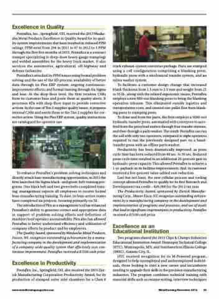 Pentaflex, Inc., Springfield, OH, received the 2013 Wauke- sha Metal Products Excellence in Quality Award for its qual- ity-system improvements that have resulted in reduced PPM ratings. PPM went from 294 in 2011 to 67 in 2012 to 3 PPM through the first five months of 2013. Pentaflex is a contract stamper specializing in deep-draw heavy-gauge stampings and welded assemblies for the heavy truck market. It also services the automotive, agricultural, off-highway and defense industries.