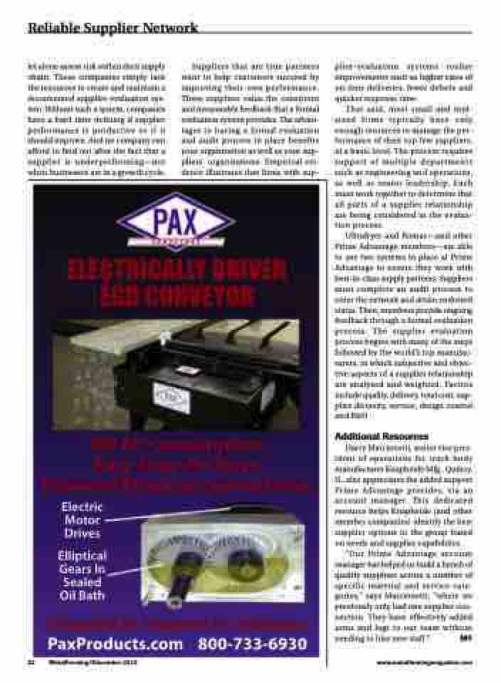Harry Marcionetti, senior vice pres- ident of operations for truck-body manufacturer Knapheide Mfg., Quincy, IL, also appreciates the added support Prime Advantage provides, via an account manager. This dedicated resource helps Knapheide (and other member companies) identify the best supplier options in the group based on needs and supplier capabilities.