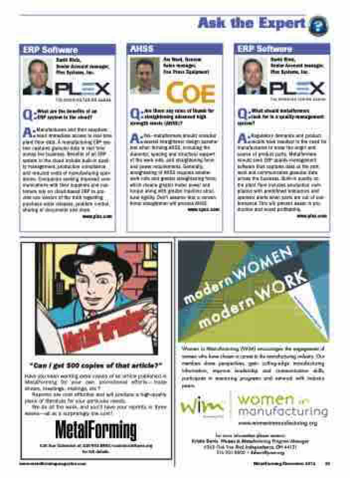 manufacturers to know the origin and source of product parts. Metalformers should seek ERP quality-management software that captures data at the part level and communicates granular data across the business. Built-in quality on the plant floor includes production com- pliance with predefined tolerances and operator alerts when parts are out of con- formance. This will prevent waste in pro- duction and boost profitability.