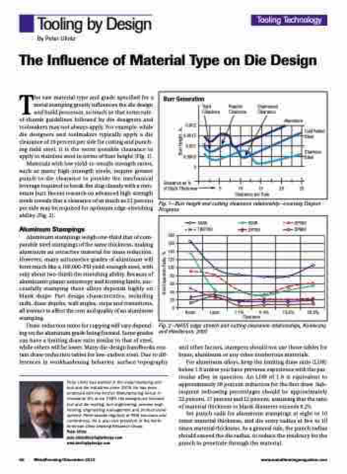 The raw material type and grade specified for a metal stamping greatly influences the die design and build processes, so much so that some rule- of-thumb guidelines followed by die designers and toolmakers may not always apply. For example, while die designers and toolmakers typically apply a die clearance of 10 percent per side for cutting and punch- ing mild steel, it is the worst possible clearance to apply to stainless steel in terms of burr height (Fig. 1).