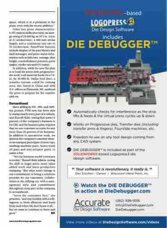 “Yes our business model continues to evolve,” Russell-Kuhr admits, noting the shift to larger parts, more value added work and more production stamping. “But what won’t change is our commitment to being a solutions provider for our customers. Collabo- ration is the rallying cry, with a man- agement style and commitment throughout every part of the company to servanthood.