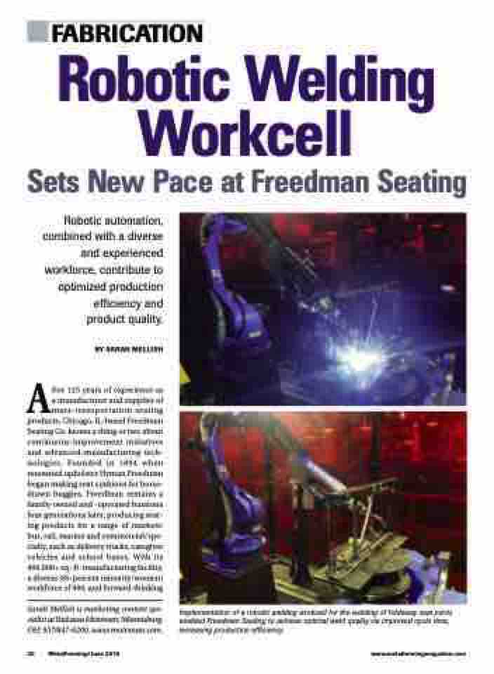 Implementation of a robotic welding workcell for the welding of foldaway seat joints enabled Freedman Seating to achieve optimal weld quality via improved cycle time, increasing production efficiency.