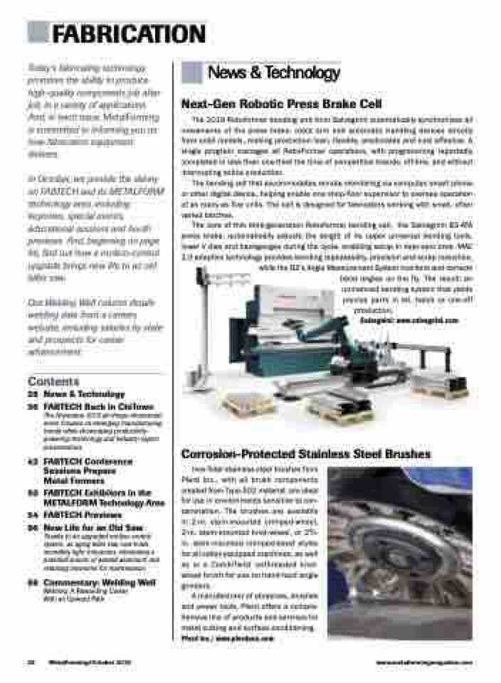 In October, we provide the skinny on FABTECH and its METALFORM technology area, including keynotes, special events, educational sessions and booth previews. And, beginning on page 86, find out how a motion-control upgrade brings new life to an old billet saw.