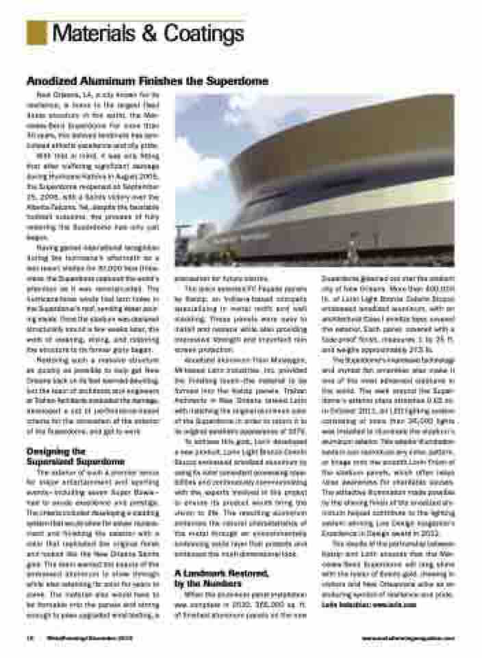 Superdome gleamed out over the resilient city of New Orleans. More than 400,000 lb. of Lorin Light Bronze ColorIn Stucco embossed anodized aluminum, with an architectural Class I anodize layer, covered the exterior. Each panel, covered with a fade-proof finish, measures 1 by 25 ft. and weighs approximately 27.5 lb.