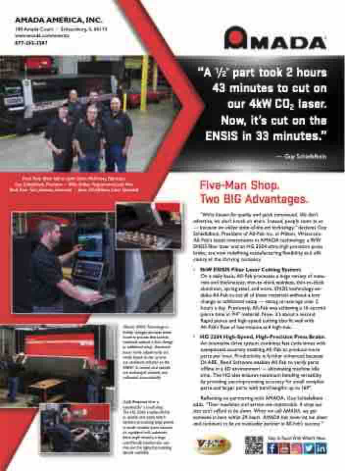 declares Guy Schiefelbein, President of All-Fab Inc. in Milton, Wisconsin. All-Fab’s latest investments in AMADA technology, a 9kW