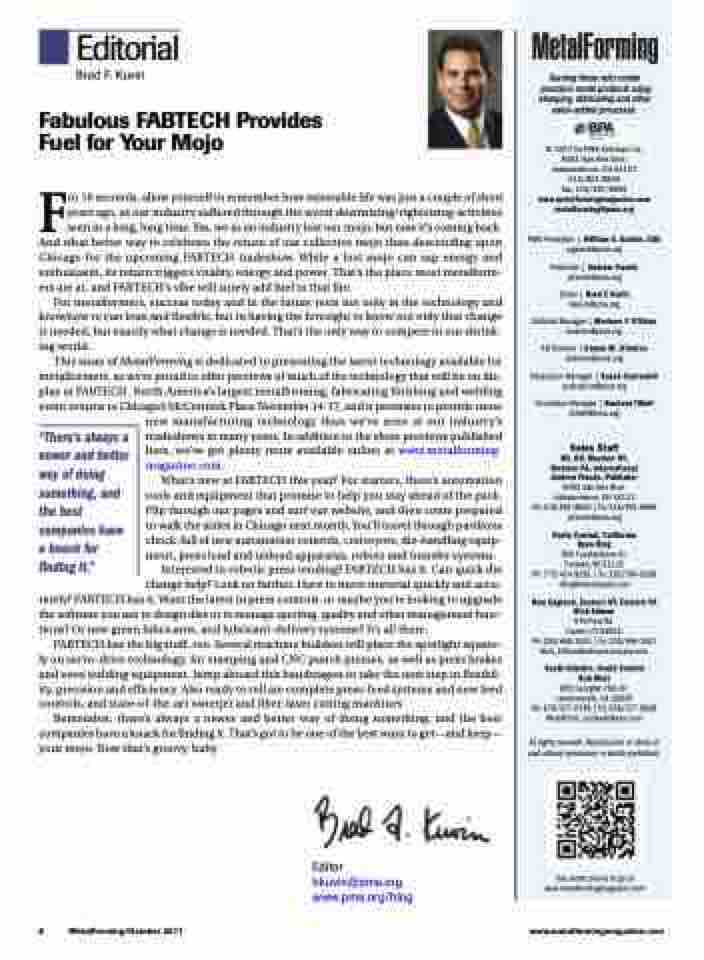 This issue of MetalForming is dedicated to presenting the latest technology available for metalformers, as we’re proud to offer previews of much of the technology that will be on dis- play at FABTECH. North America’s largest metalforming, fabricating finishing and welding event returns to Chicago’s McCormick Place November 14-17, and it promises to provide more