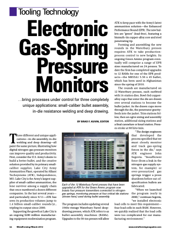 Three different and unique appli- cations—in-die assembly, in-die welding and deep drawing—all paint the same picture, illustrating how digital nitrogen-gas pressure monitors can improve quality and productivity. First, consider the U.S. Army’s desire to build a better bullet, and the creative solution provided by its primary small- caliber supplier, Lake City Army Ammunition Plant, operated by Alliant Techsystems (ATK), Independence, MO. Lake City is the Army’s largest sup- plier of small-caliber ammunition, the lone survivor among a supply chain that once numbered a dozen different companies. In the last several years— and particularly since 9/11—ATK has seen its production volumes jump to 1.4 billion small-caliber rounds/yr., tripling its output since 2000.
