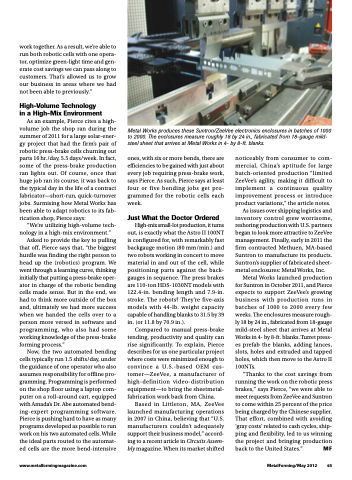 As an example, Pierce cites a high- volume job the shop ran during the summer of 2011 for a large solar-ener- gy project that had the firm’s pair of robotic press-brake cells churning out parts 16 hr./day, 5.5 days/week. In fact, some of the press-brake production ran lights out. Of course, once that huge job ran its course, it was back to the typical day in the life of a contract fabricator—short-run, quick-turnover jobs. Surmising how Metal Works has been able to adapt robotics to its fab- rication shop, Pierce says: