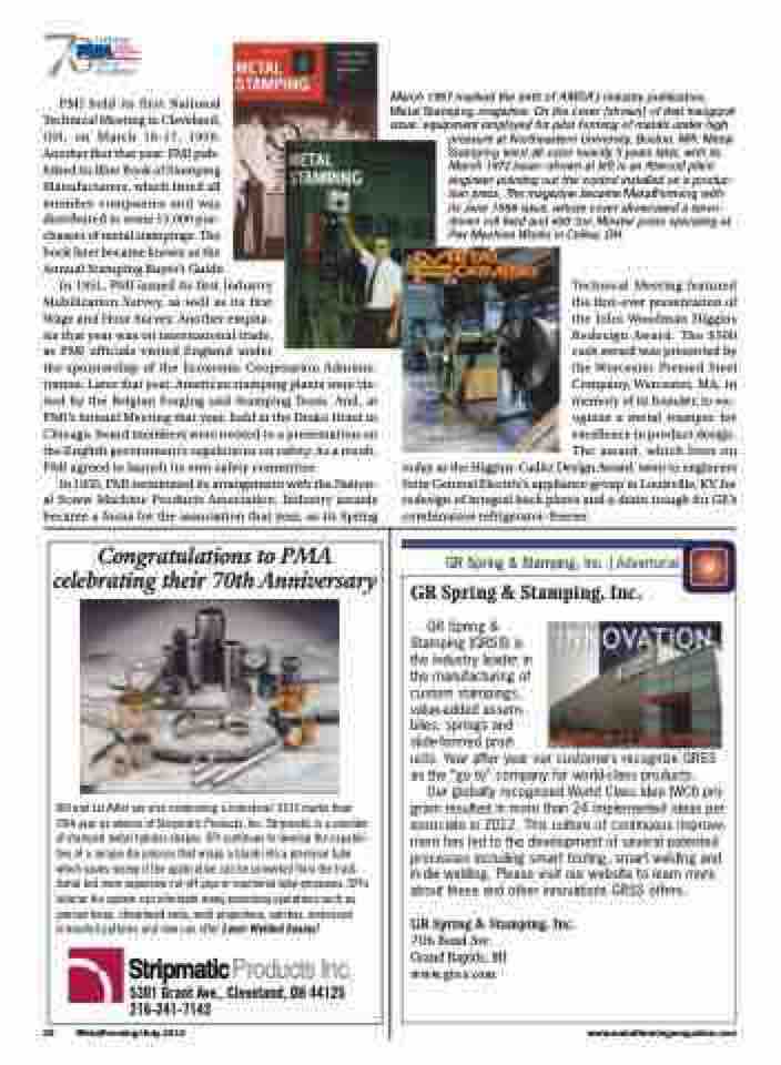Bill and Liz Adler are also celebrating a milestone! 2012 marks their 20th year as owners of Stripmatic Products, Inc. Stripmatic is a provider of stamped metal tubular shapes. SPI continues to develop the capabili- ties of a unique die process that wraps a blank into a precision tube which saves money if the application can be converted from the tradi- tional but more expensive cut off pipe or machined tube processes. SPI’s tubular die system can eliminate many secondary operations such as pierced holes, chamfered ends, weld projections, notches, embossed