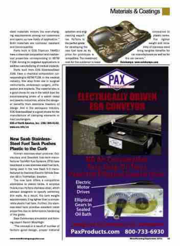 Finnish stainless-steel producer Out- okumpu and Swedish fuel-tank-manu- facturer TechROi Fuel Systems (TFS) have developed a new stainless-steel fuel tank, being used in the new Saab 9-3 manu- factured by National Electric Vehicle Swe- den AB in Trollhättan, Sweden.