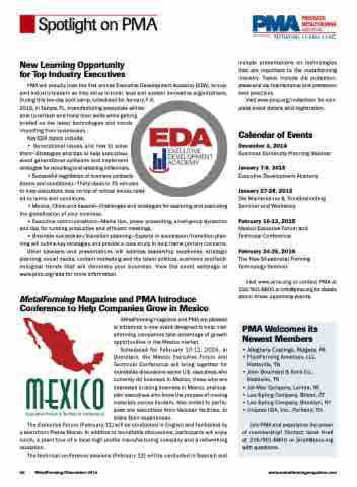 MetalForming magazine and PMA are pleased to introduce a new event designed to help met- alforming companies take advantage of growth opportunities in the Mexico market.