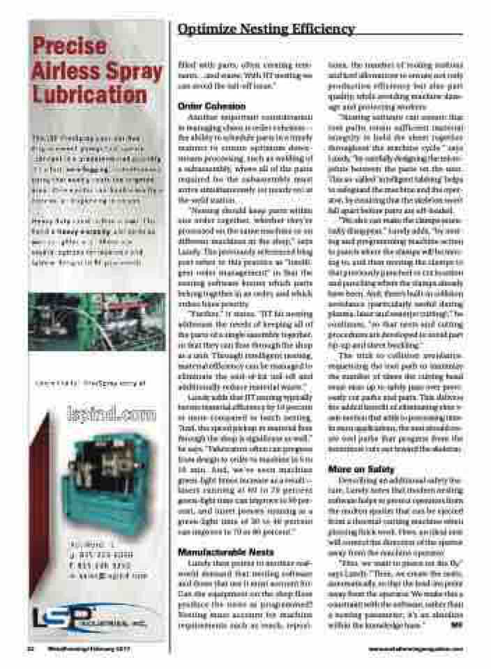 Lundy then points to another real- world demand that nesting software and those that use it must account for: Can the equipment on the shop floor produce the nests as programmed? Nesting must account for machine requirements such as reach, reposi-