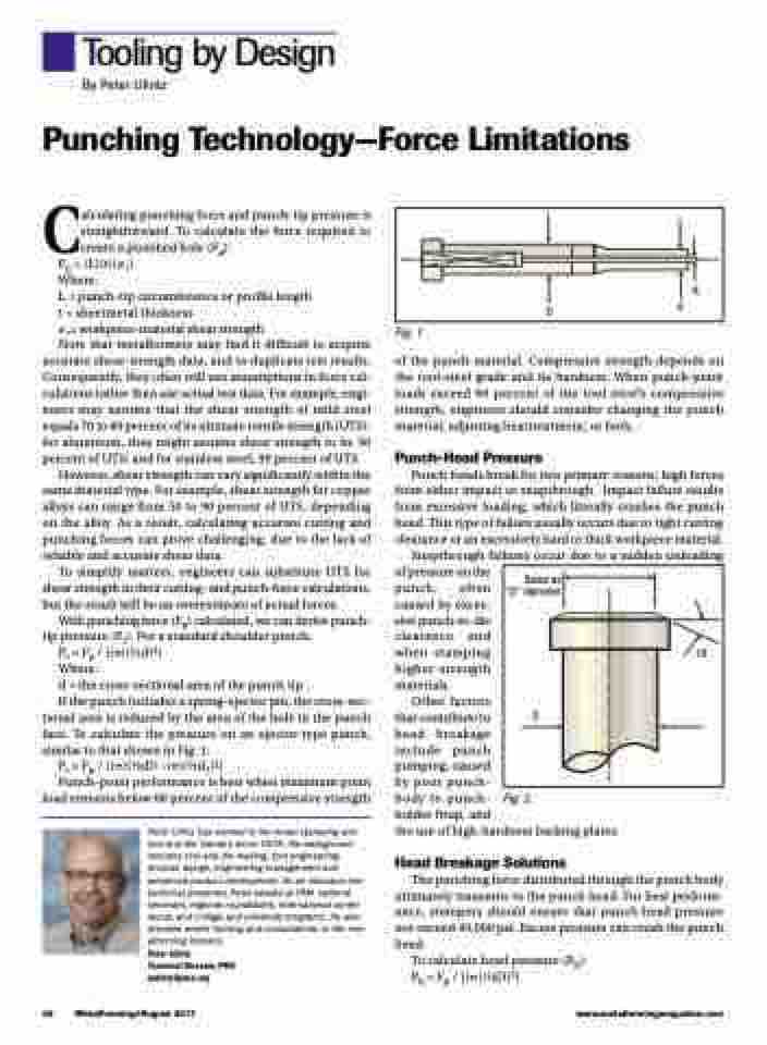 Calculating punching force and punch-tip pressure is straightforward. To calculate the force required to create a punched hole (F ):