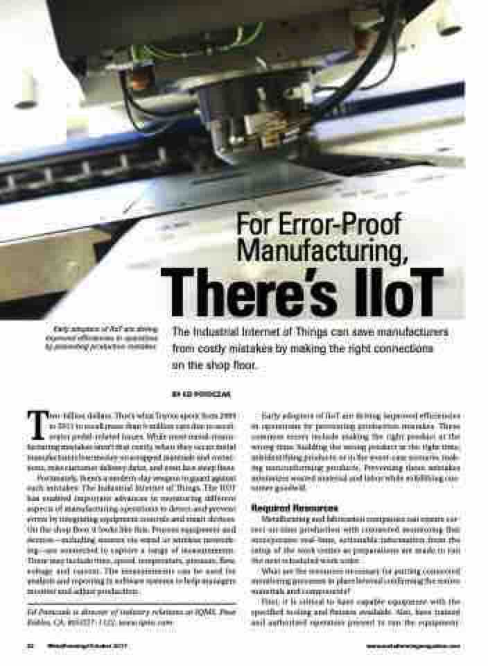 Fortunately, there’s a modern-day weapon to guard against such mistakes: The Industrial Internet of Things. The IIOT has enabled important advances in monitoring different aspects of manufacturing operations to detect and prevent errors by integrating equipment controls and smart devices. On the shop floor it looks like this: Process equipment and devices—including sensors via wired or wireless network- ing—are connected to capture a range of measurements. These may include time, speed, temperature, pressure, flow, voltage and current. The measurements can be used for analysis and reporting in software systems to help managers monitor and adjust production.