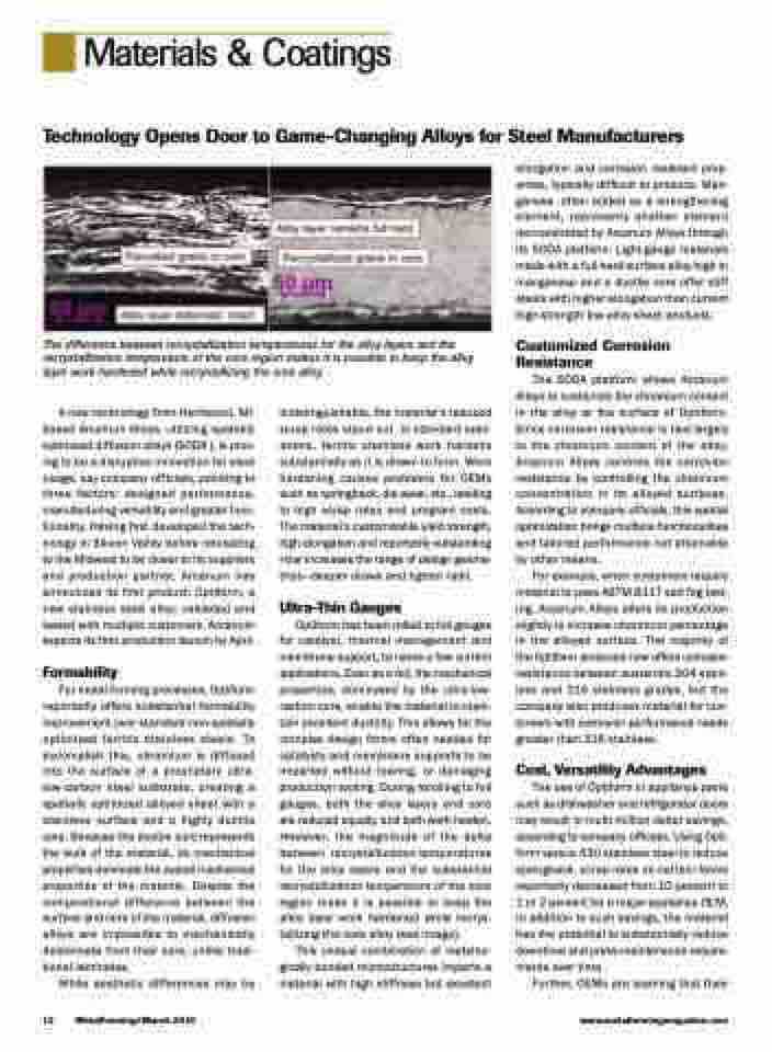 A new technology from Kentwood, MI- based Arcanum Alloys, utilizing spatially optimized diffusion alloys (SODA ), is prov- ing to be a disruptive innovation for steel usage, say company officials, pointing to three factors: designed performance, manufacturing versatility and greater func- tionality. Having first developed the tech- nology in Silicon Valley before relocating to the Midwest to be closer to its suppliers and production partner, Arcanum has announced its first product: Optiform, a new stainless steel alloy; validated and tested with multiple customers. Arcanum expects its first production launch by April.